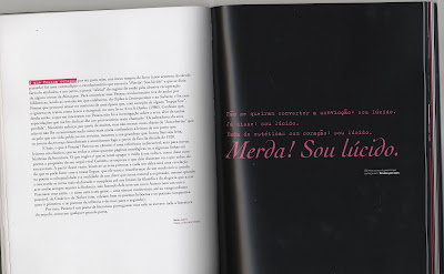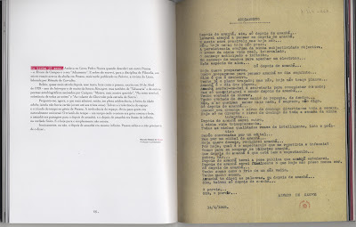 Falando do que mais gostei 'Fernando Pessoa, o editor, o escritor e os seus leitores' é um livro onde são várias as pessoas da nossa praça que escrevem da sua relação com o poeta. Em cada página dupla encontramos, do lado esquerdo, o depoimento e na página da direita uma frase, um verso ou um poema do Fernando Pessoa que tem alguma ligação ao depoimento. E pasmem-se: não há nenhuma mega empresa de design por detrás e, no entanto, possui uma paginação soberba. Não sei se gostam, mas sei que assim que tiver oportunidade vou lá comprar um exemplar aqui para a je.